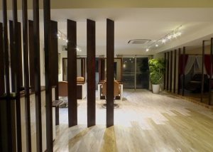 店内は白い壁、白い天井、間仕切りの代わりに足場板を木ルーバーとして利用したシンプルなデザインでまとめています。