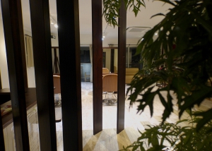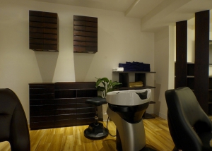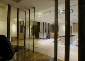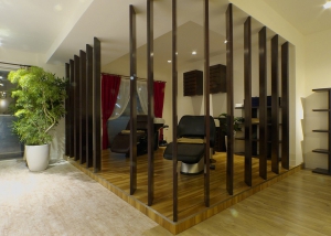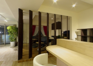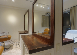 待合スペースには、バーカウンターを設けドリンクを飲みながら、リラックスして、時間を過ごせる空間です。また、家具類もアンティーク塗装で仕上げ落ち着いた雰囲気を作り出しています。
