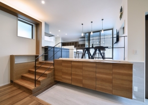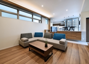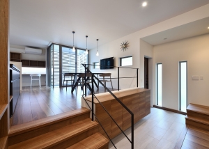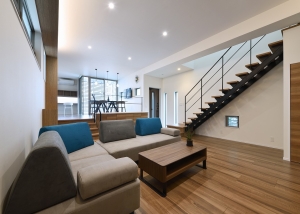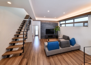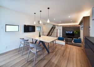 1Fは天高を抑えた駐車場スペースになっており、2FスペースはLDK+浴室のレイアウトの構成で、40畳近いLDKはスキップフロアと3mを超える天井により、広々とした立体的な空間となっています。