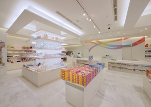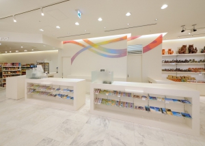また、レジ後ろの曲線のグラフィックパネルは、リゾートを意識してトロピカルな色合いで演出しています。